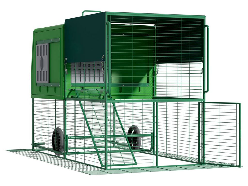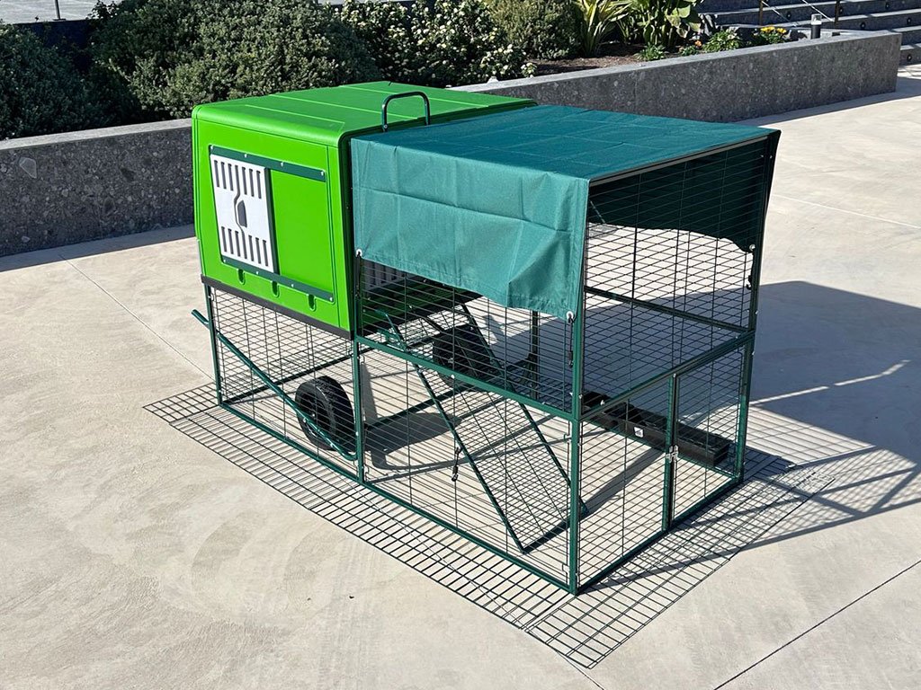 Mobilný kurín pre sliepky, vhodný pre 4-6 sliepok, integrovaný výbeh, kolieska pre ľahkú manipuláciu, kvalitný a odolný materiál, ľahká údržba, moderný dizajn, rozmer 120,7x204,5x120 cm.